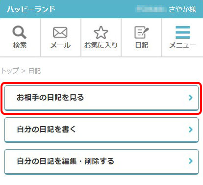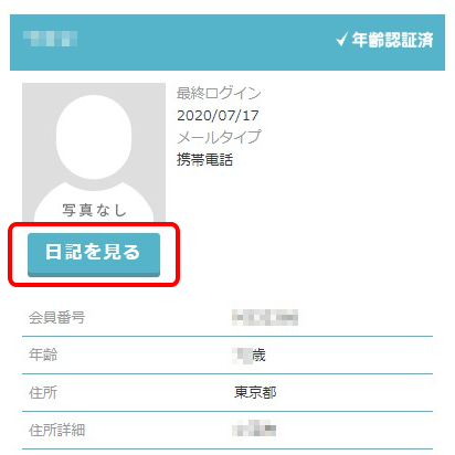 日記の探し方は2通りあります。 まず、分かりやすいのがお相手のプロフィールにある「日記を見る」というボタンをクリックする方法です。 こちらのボタンは日記を書いている方のみに表示されます。