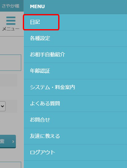 日記を書いている人だけを検索する方法です。 メニューをクリックして、「日記」をクリックしてみてください。