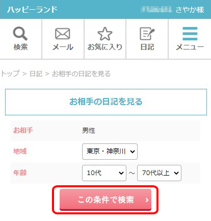 次にこちらのページが開きますので、「日記を探す」をクリックし、お相手のご希望の地域、年齢を選択して「この条件で検索」をクリックしましょう。
