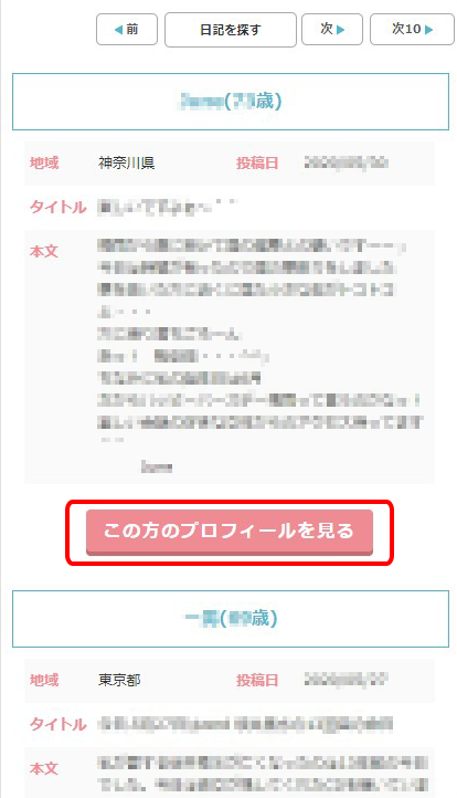 そうすると日記の一覧が表示されます。 表示は1ページに5件表示されますので、気になる方がいらっしゃったら「この方のプロフィールを見る」をクリックしてプロフィール詳細を閲覧することが出来ます。