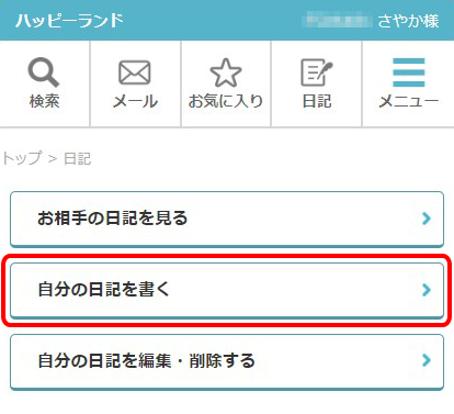日記の探し方を見てきましたので、書き方は簡単です。 同じようにメニューから「日記」を選び、今度は「日記を書く」をクリックしましょう。