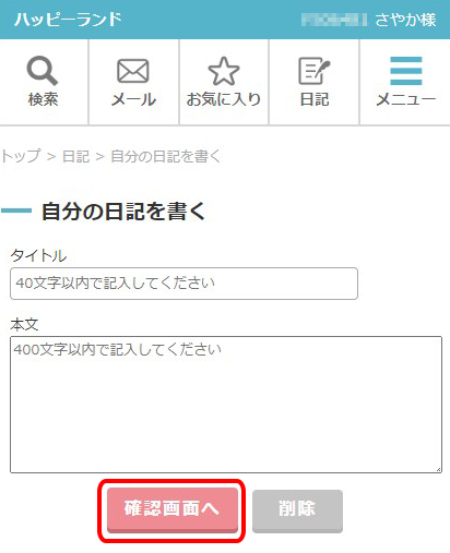 記入する部分は2箇所です。 タイトル40文字、本文400文字まで記入することが出来ます。 記入したら「確認画面へ」をクリックして投稿しましょう。