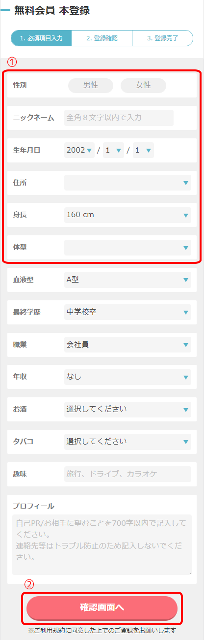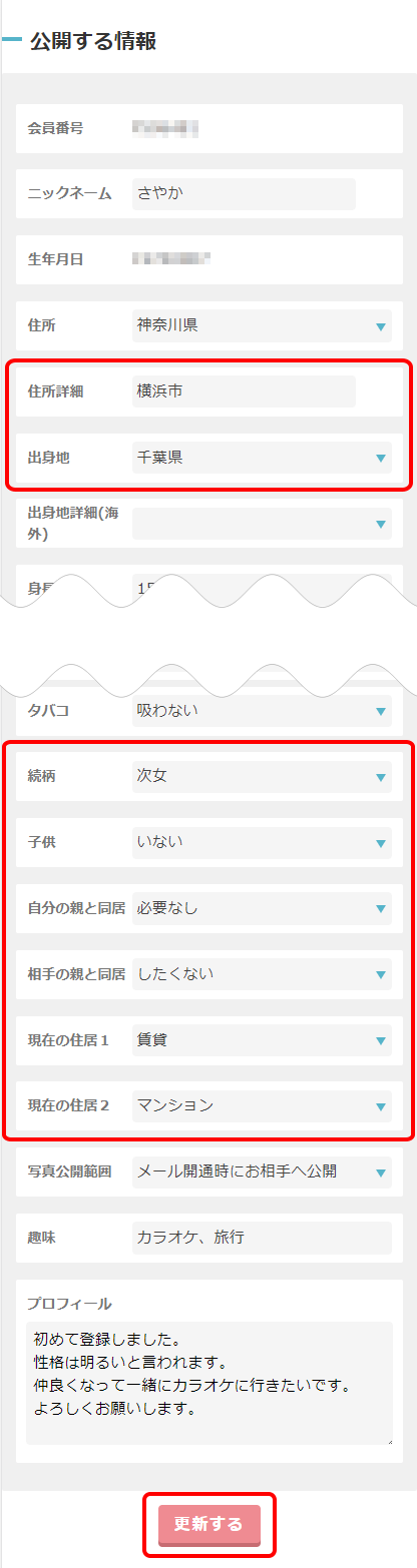 すべての項目が必須項目ではありませんが、出来る限り埋めることで出会いのチャンスは広がります。